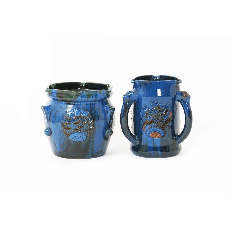 A Sunflower Pottery tyg by Sir Edmund Elton, swollen cylindrical form with pinched rim, the handles with mask terminals, slip applied with panels of flowers and foliage in shades of blue and brown on a streaked blue ground, and another Sunflower Pottery vase by Sir Edmund Elton Painted Elton mark, 21.5cm. high (2)