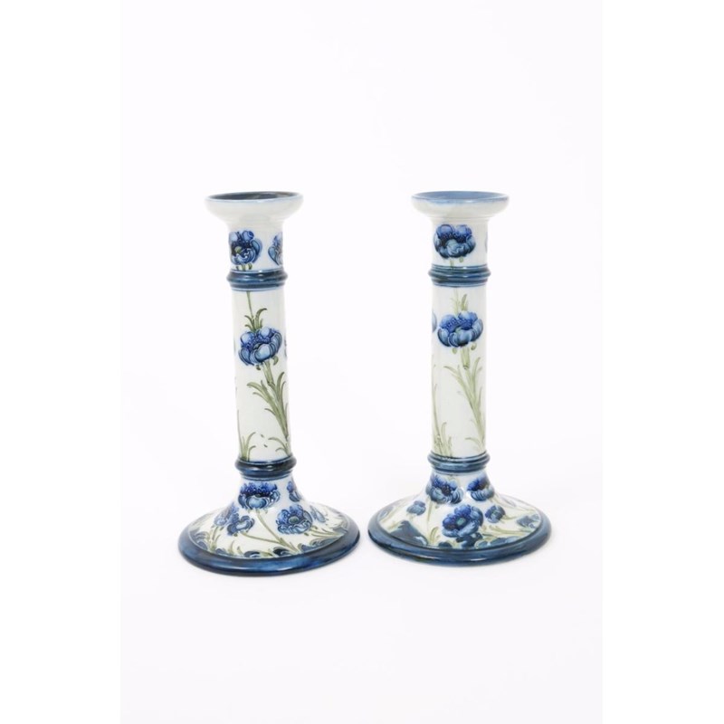 'Anemone' a pair of James Macintyre & Son candlesticks designed by William Moorcroft, painted in shades of blue and green on a white ground, printed mark, painted green signature, professional restoration to sconce of one, 20.5cm. high (2).