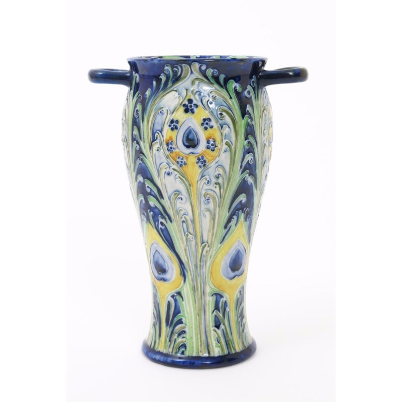 'Peacock Feathers' a James Macintyre Florian Ware vase designed by William Moorcroft, painted in shades of green, yellow and blue, printed mark, painted green signature, professionally restored handles, 19cm. high