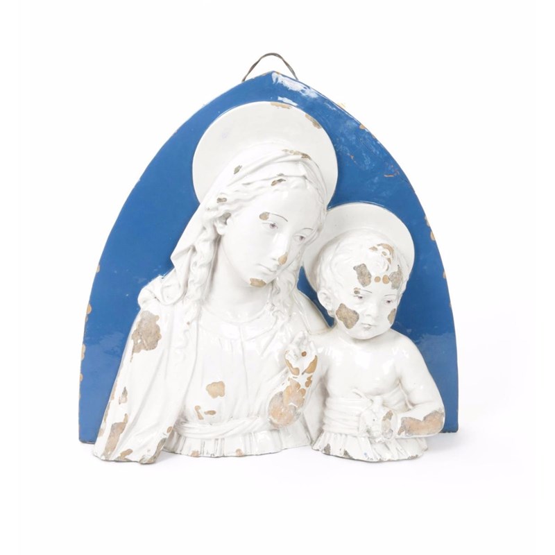 A Della Robbia style architectural panel by Cantagalli, modelled in relief with the Madonna and Child, glazed in blue and white impressed cockerel roundel, chips and losses, 50cm. high, 53cm wide.