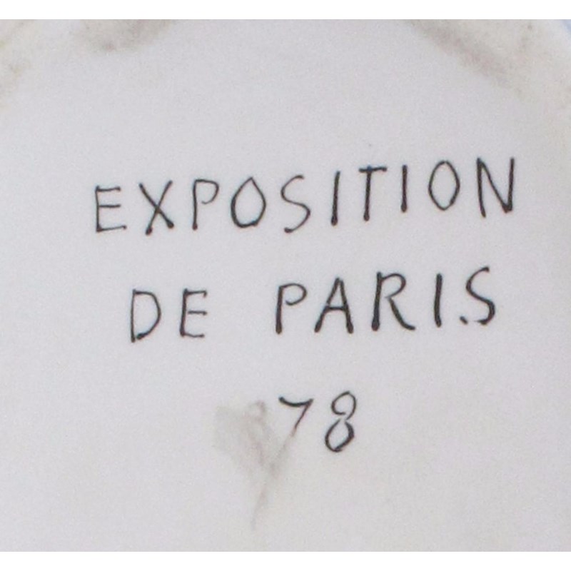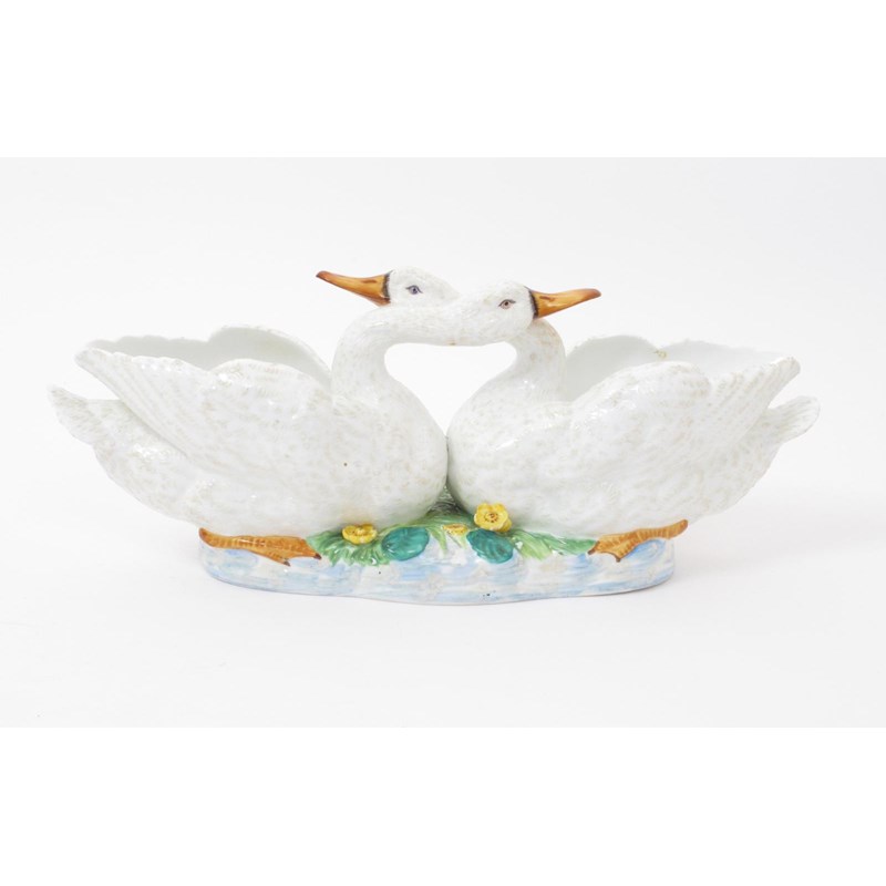 A Vion & Baury swan centrepiece, modelled as two entwined swimming amidst waterlily flowers, in colours printed anchor mark, painted Exposition de Paris 78, minor chips to tail feathers, 42cm. wide.