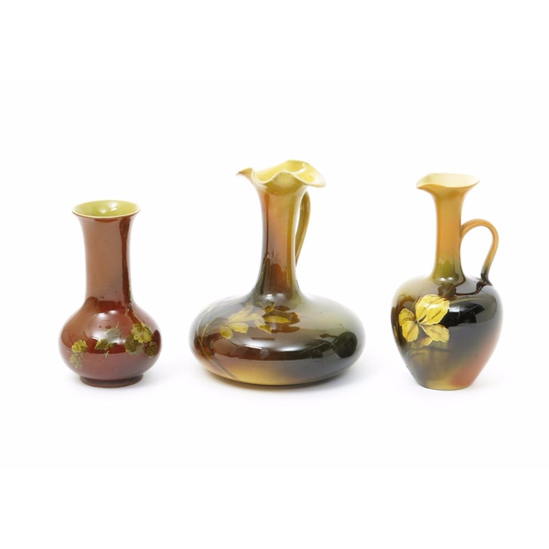 A Rookwood Pottery vase, model no.486, ovoid with cylindrical neck, painted with foliage in green and yellow on brown ground, and two Rookwood Pottery ewers, repaired damages, restoration tallest 21cm. high (3).