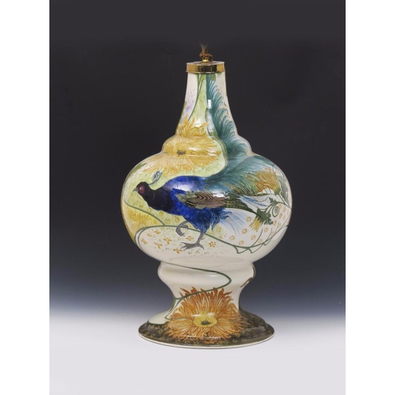 A large Art Nouveau Gouda Pottery vase, painted with an exotic blue bird with long tail, amidst panels of stylised flowers and foliage in purple, yellow and green on a white ground with later gilt metal lamp mount painted marks, 61cm. high