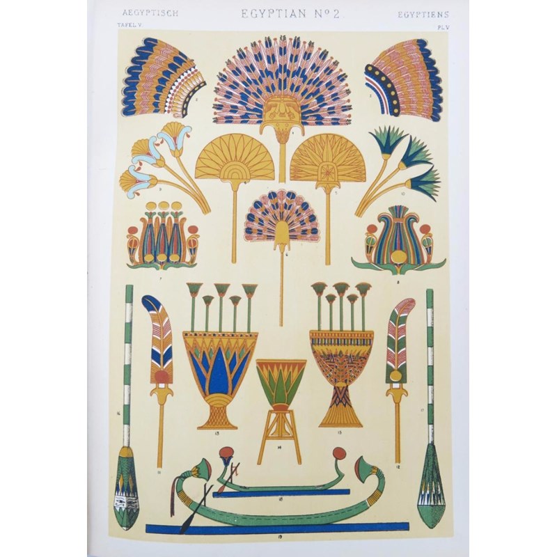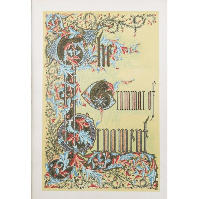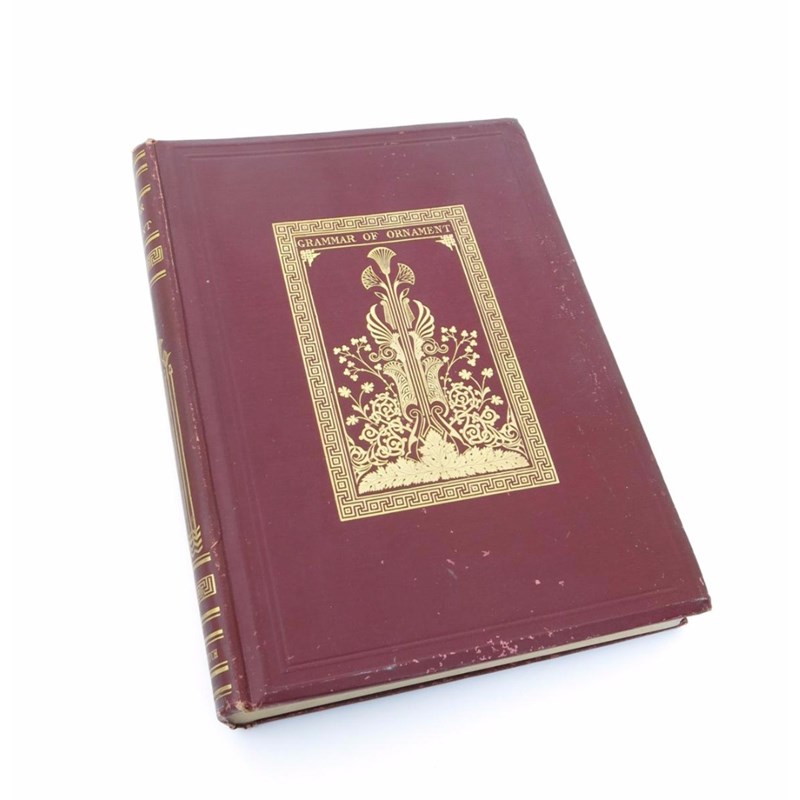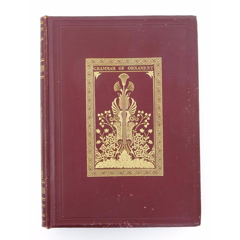 The Grammar of Ornament by Owen Jones, 1868, published by Bernard Quaritch, London, chromolithographic colour plates, original burgundy cloth binding, with gilt decoration to upper cover, folio. 34 x 25.5cm.