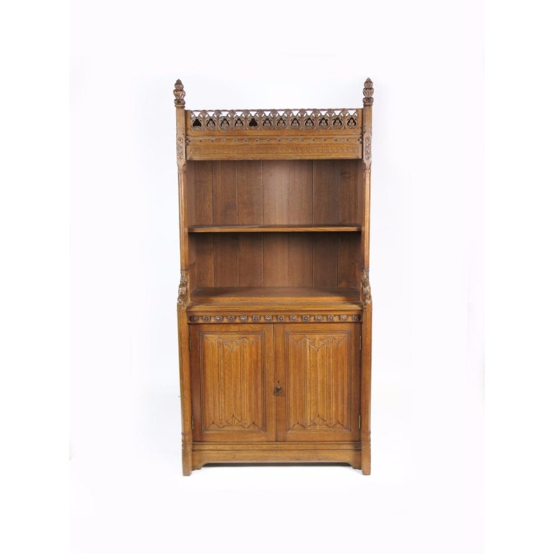 A carved oak cabinet the design attributed to A.W.N. Pugin, possibly manufactured by J D Crace, with deep carved foliate moulding and cresting finials, open book case with adjustable shelves above twin-cupboard with carved linen panels to doors, 104cm. wide, 60cm. deep, 218cm. high