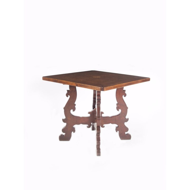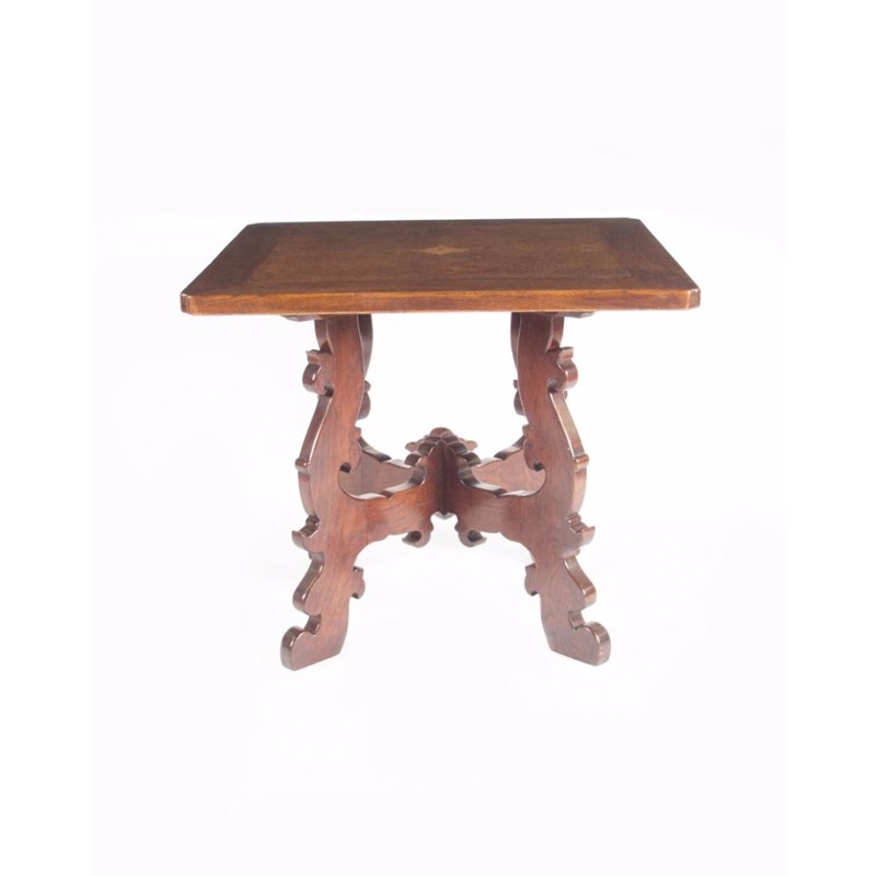A Whytock & Reid oak and burr oak quartered walnut occasional table designed by Sir Robert Lorimer (1864-1929), the canted, square top with quartered walnut panels, on cruciform carved legs 84cm. square, 73cm high