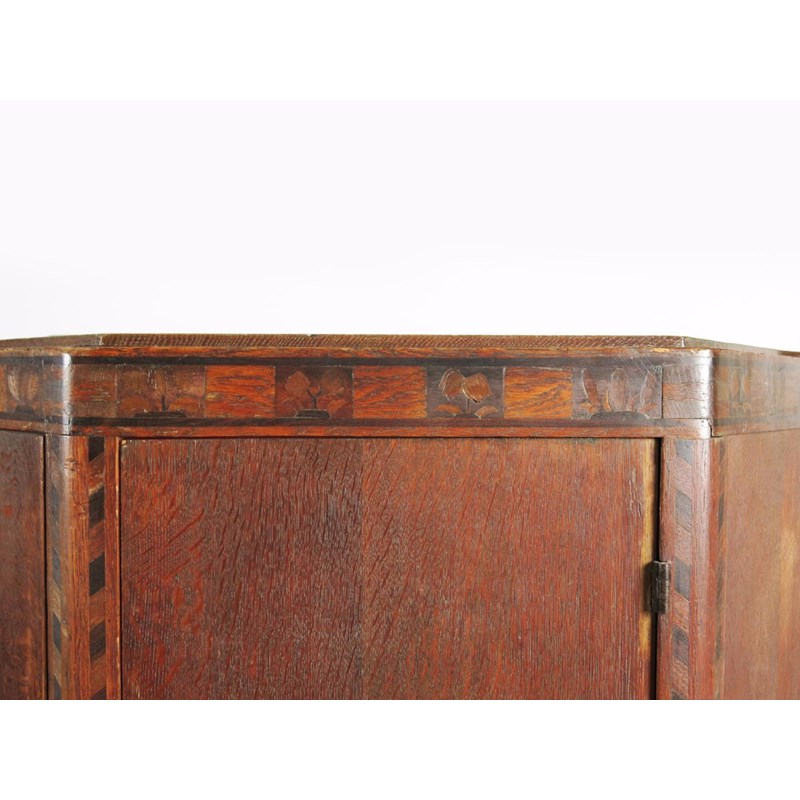 An oak cupboard by Sidney Barnsley, with angled sides and front, four hinged cupboard doors, the frame inset with columns chevrons and a border of inlaid flower panels in holly and ebony, on five chamfered legs, the interior with shelves, painted red, later alterations, 153cm. high, 90cm wide, 53cm deep.