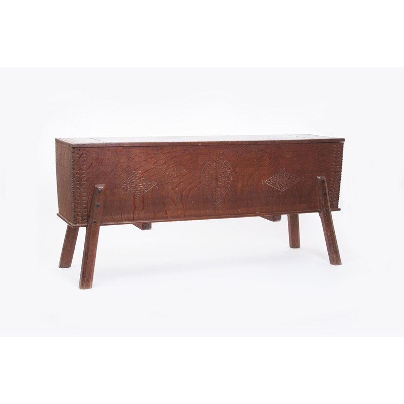 An oak coffer by Sidney Barnsley, rectangular section with hinged lid and flaring feet, chip carved heart and diamond motif to front, chip carved panels to edges and wrought iron furniture, 120cm wide, 30cm deep, 54cm. high