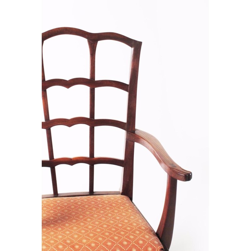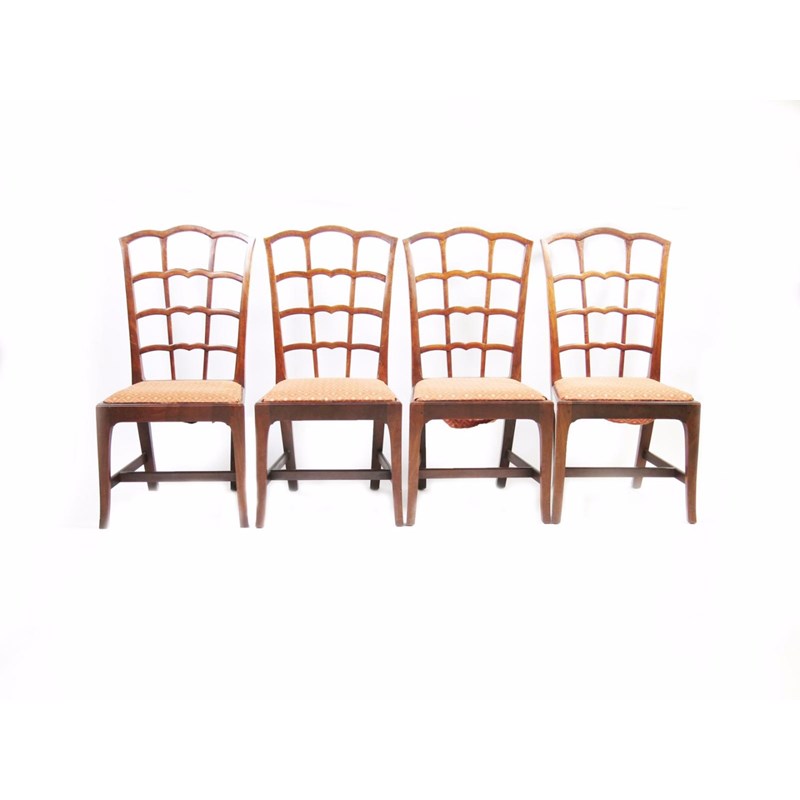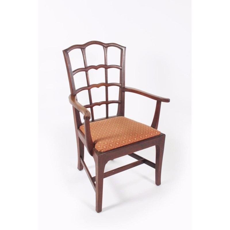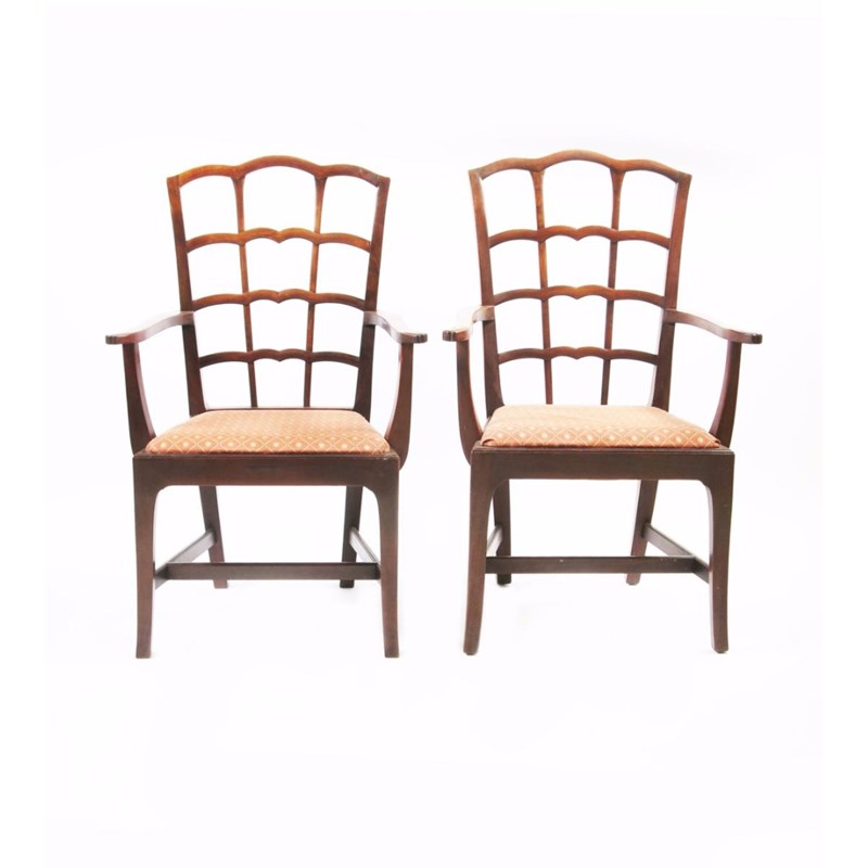 A set of eight Cuban mahogany dining chairs designed by Edward Barnsley, 1934, with flaring lattice backs, comprising two carvers and six chairs, with drop in seat pads unsigned 104cm. high
