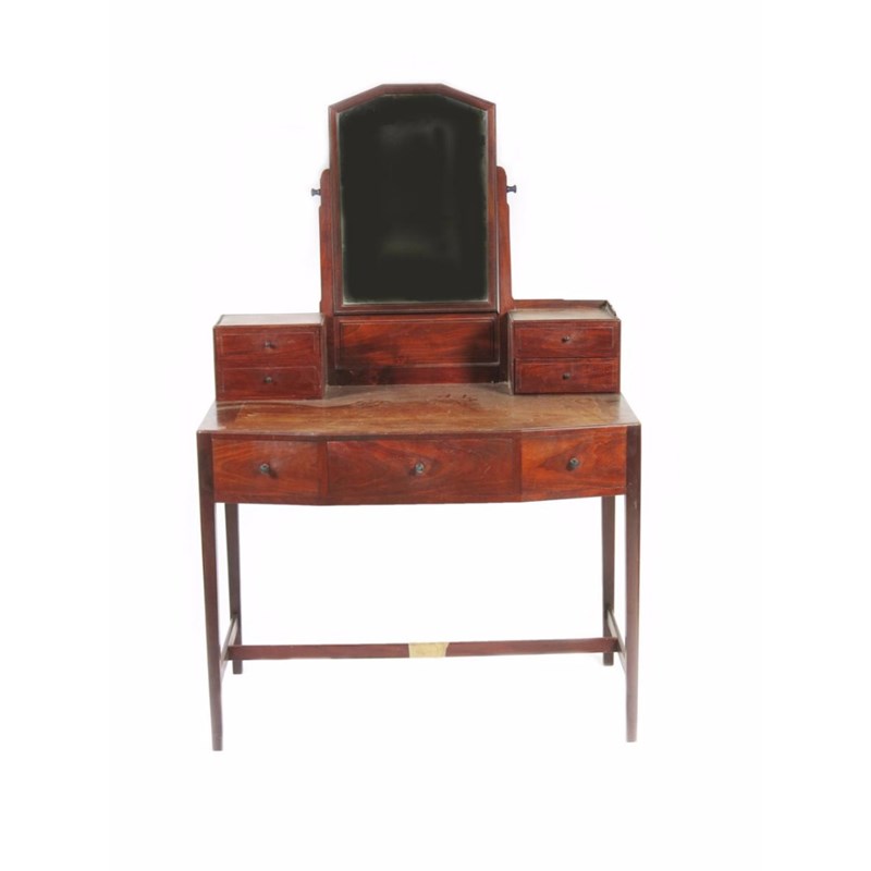 A dressing table by Edward Barnsley, the shaped rectangular top with three drawers, the adjustable mirror between short drawers, ebony handles, 99cm wide, 51cm deep, 150cm. high