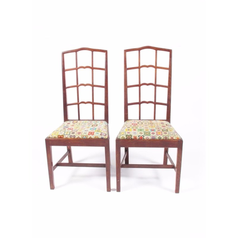 A pair of walnut hall chairs designed by Edward Barnsley, with lattice backs and drop in embroidered seats, unsigned 106cm. high