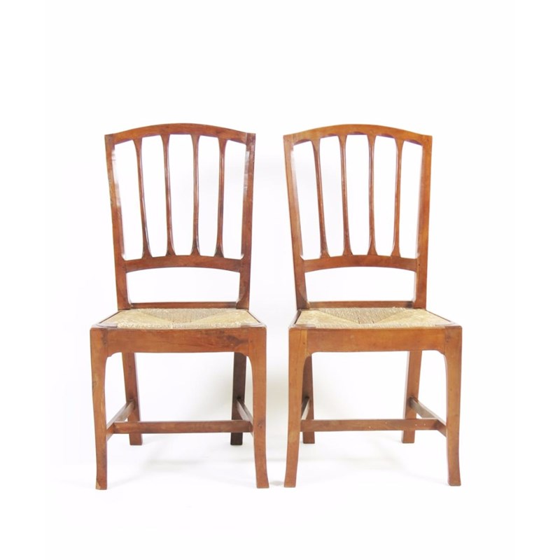 A pair of Yew hall chairs by Edward Barnsley, with spindle backs and drop in rush seats, 99cm. high. (2)
