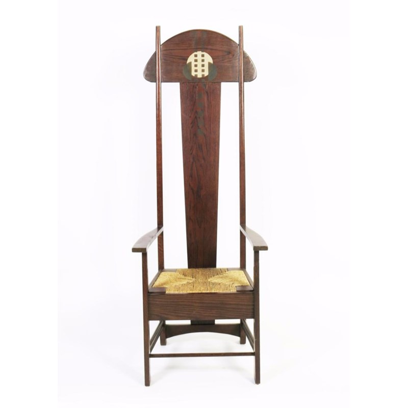 A modern Bruce Hamilton oak high-back chair after a design by Charles Rennie Mackintosh, originally for The House of an Art Lover, with stencilled design to the back, with drop in strung seat, applied maker's label and stencilled marks to underside 165cm. high