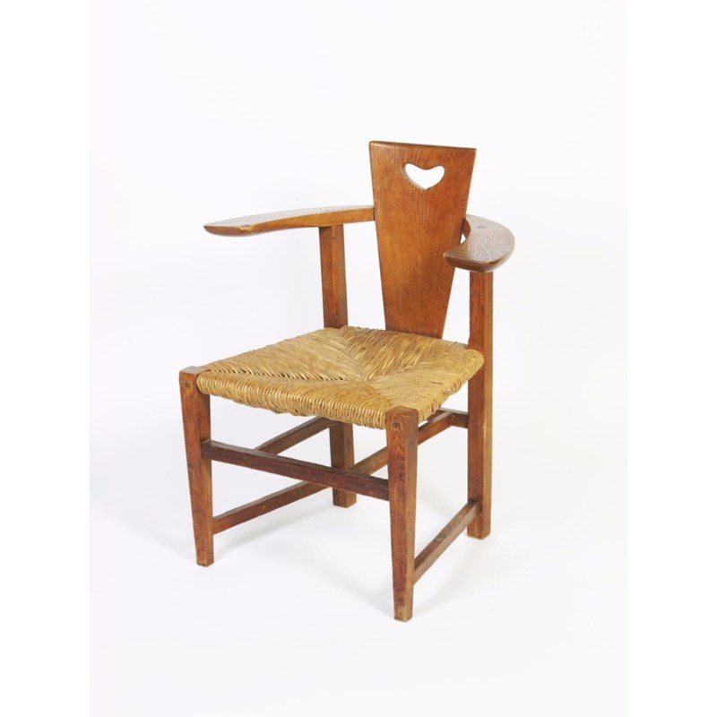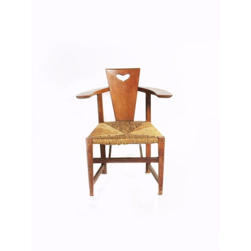 An oak Abingwood chair designed by George Walton, solid upright back with heart-shape cut out, wide sweeping arms, rush seat, 82cm. high.