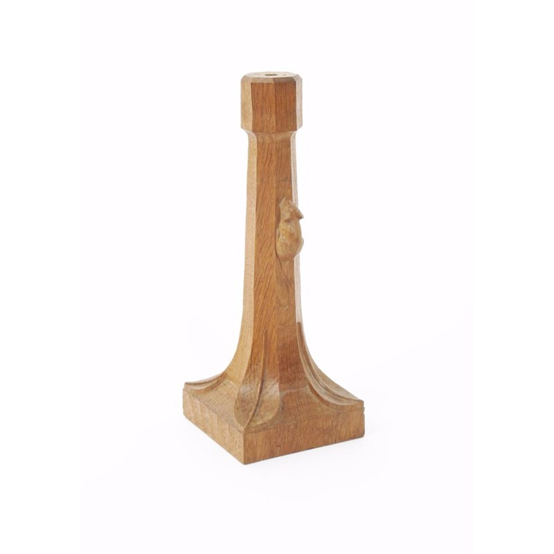 A Robert Mouseman Thompson oak table lamp, the tapering stem with carved foliate motif, carved mouse signature 25.5cm. high