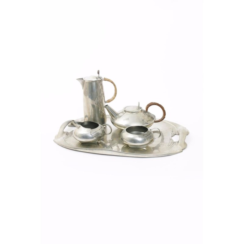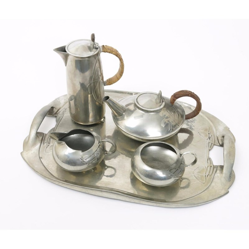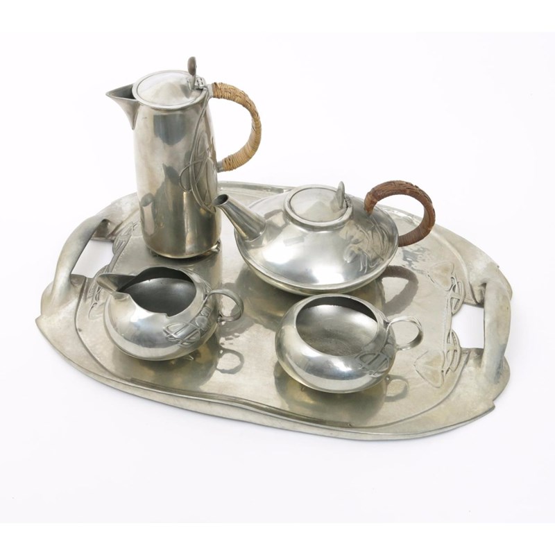 A Liberty & Co Tudric Pewter four piece tea set on tray designed by Archibald Knox