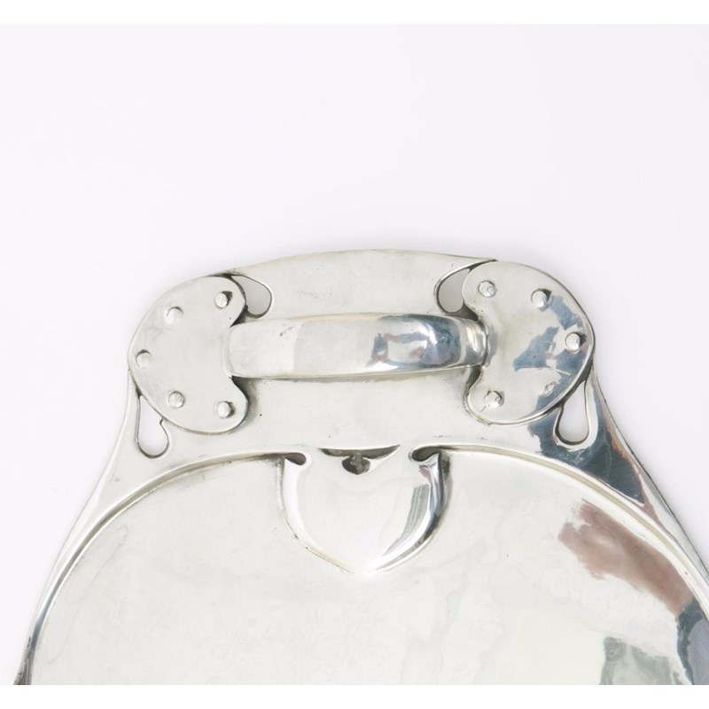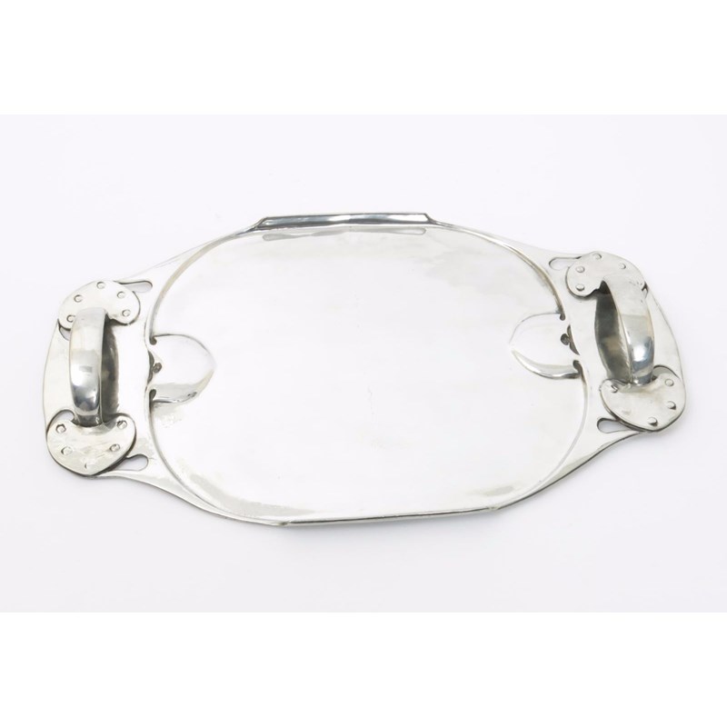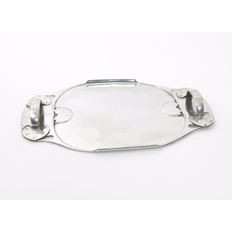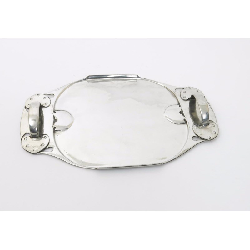 A Liberty & Co pewter tray designed by Archibald Knox, model no.42, twin-handled form, cast with simple rivet and heart shaped panel decoration stamped marks, 47cm. wide