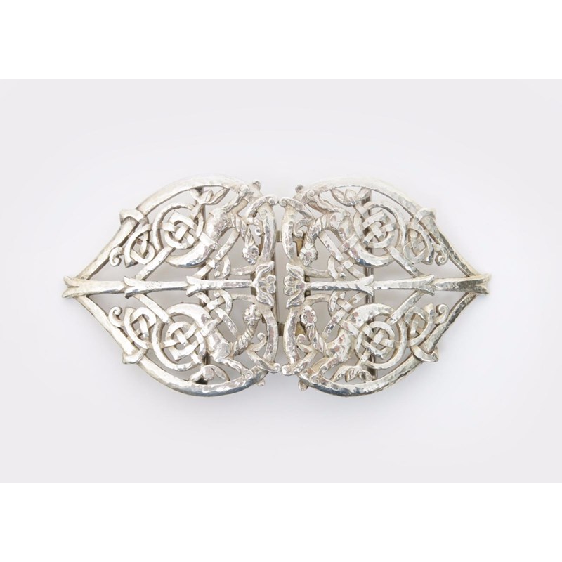 A Liberty & Co silver belt buckle, model no.0198, in the manner of Mary Seton Watts, the pierced and cast design decorated with creatures entwined in Celtic knot motif, stamped marks, Birmingham 1896 11cm. wide