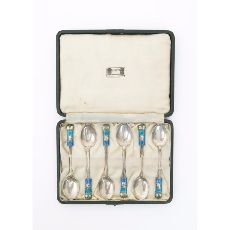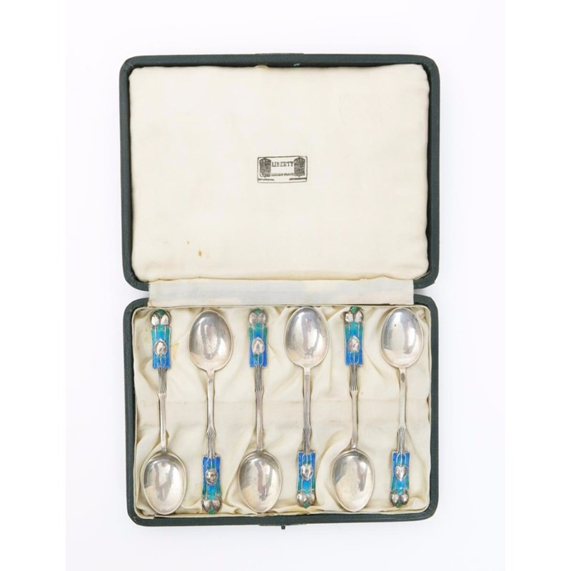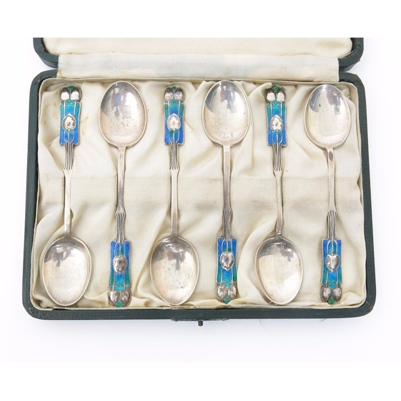 A set of six Liberty & Co silver and enamel teaspoons designed by Archibald Knox