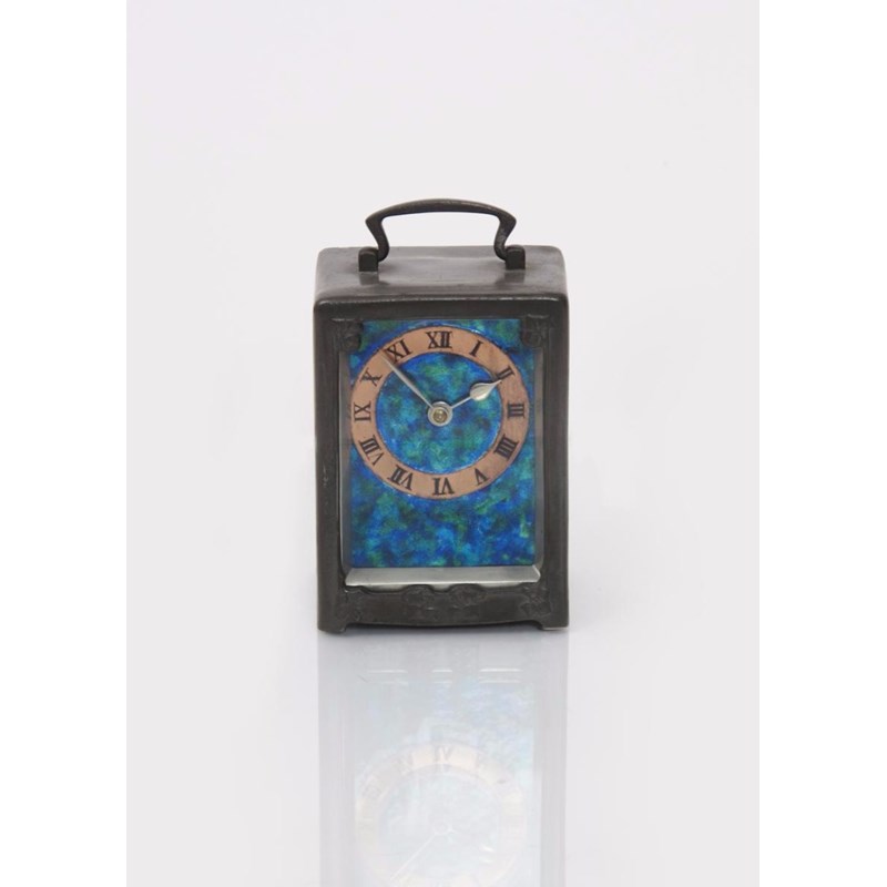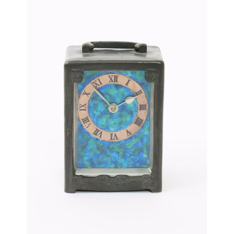 A Liberty & Co English Pewter clock designed by Archibald Knox, model no.0721, rectangular form cast in low relief with stylised ivy panels, the rectangular face enamelled green and blue, with circular dial with Roman numerals, stamped marks, 12cm. high