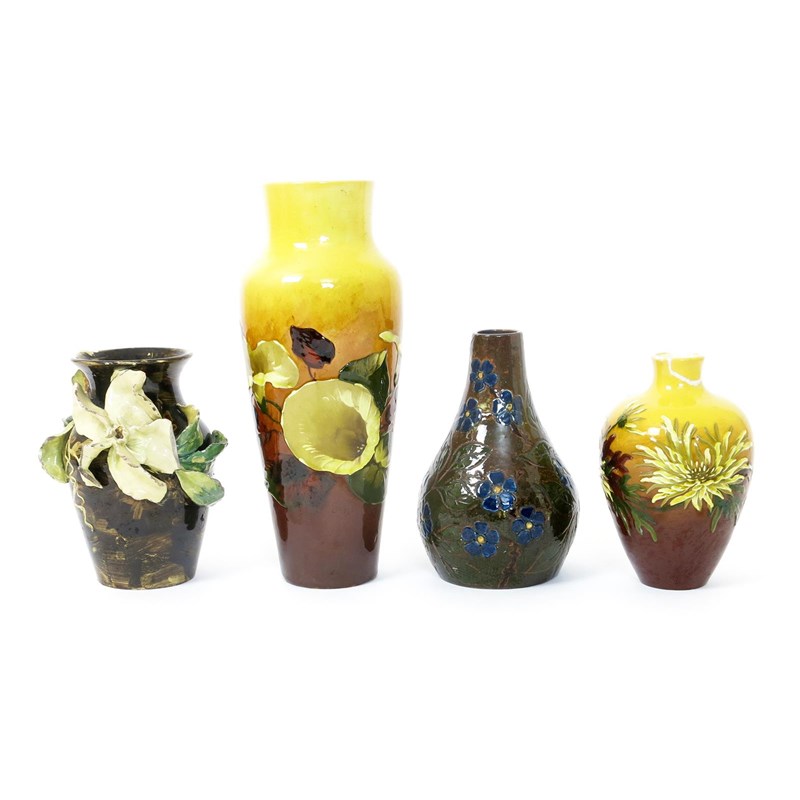 A Burmantofts Faience Barbotine vase, model no.1557, shouldered form, painted with a frieze of convolvulus flowers in colours on a yellow ground, another smaller, a Burmantofts vase with applied flowers and another vase impasto decorated with blue flowers impressed marks, glaze loss and chips, 30cm. high, (4)