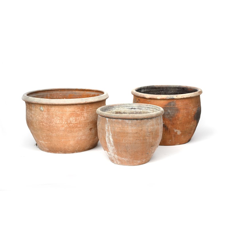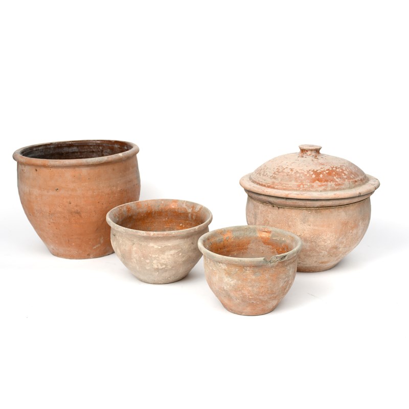 Four large graduated pots, glazed to the interior, two smaller pots, a pot and cover, a lid and two other pots,