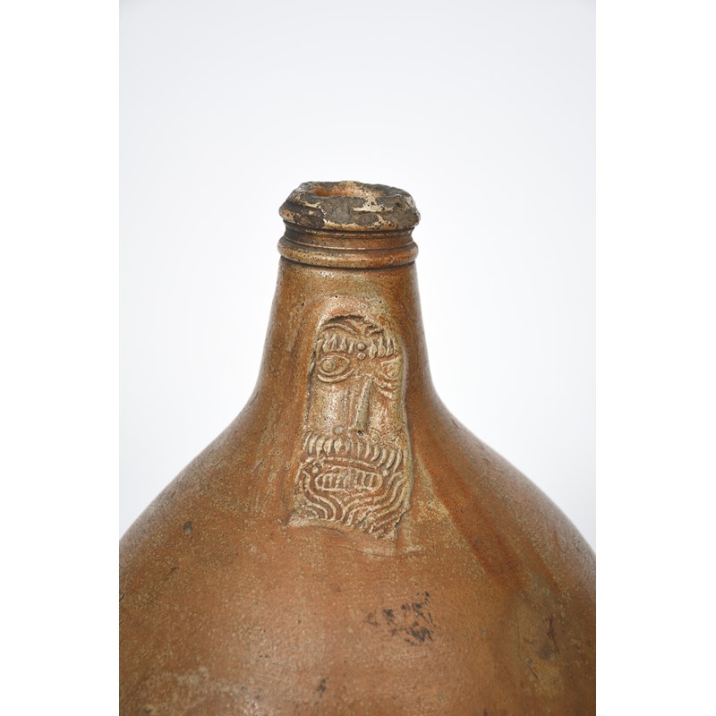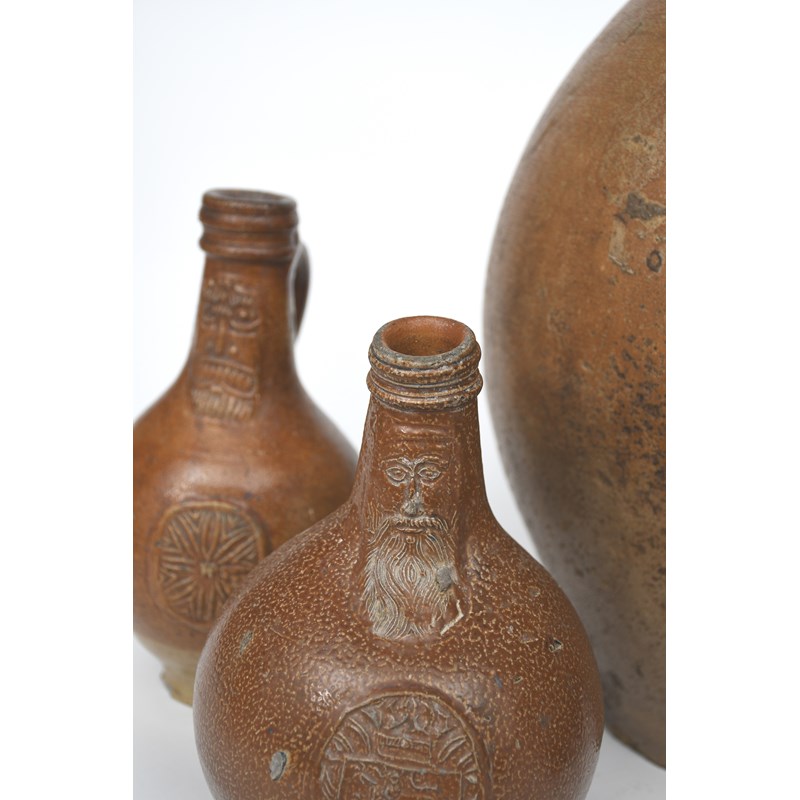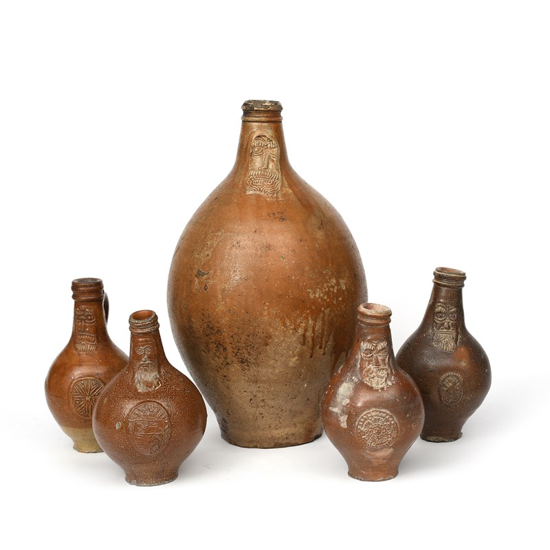 A tall salt-glaze stoneware Bellarmine jar, swollen form, the narrow neck incised with bearded face, and four others smaller,