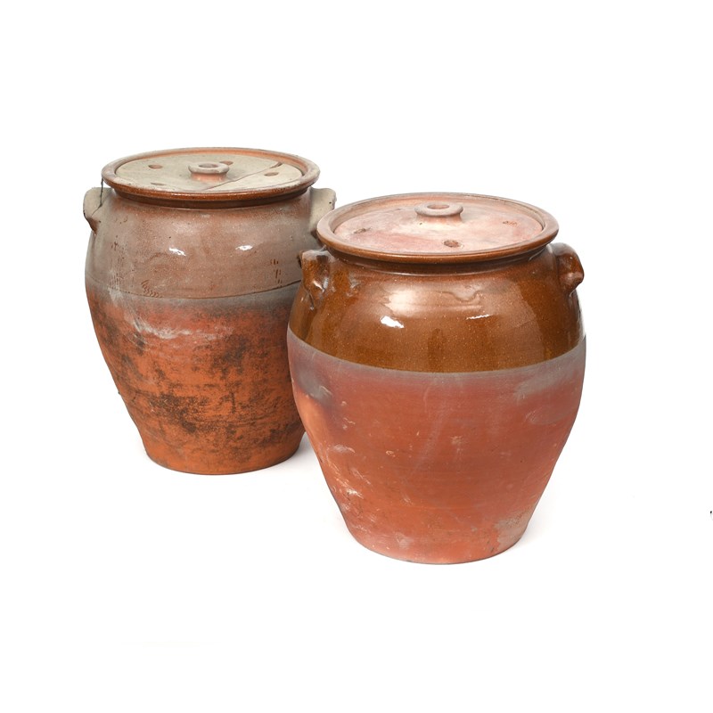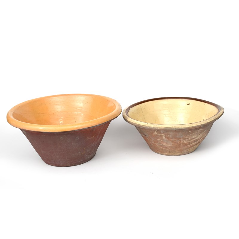 A Soil Hill Pottery twin-handled bread bin and pierced cover, glazed to the foot, another similar and two Soil Hill Pottery pippin bowls,