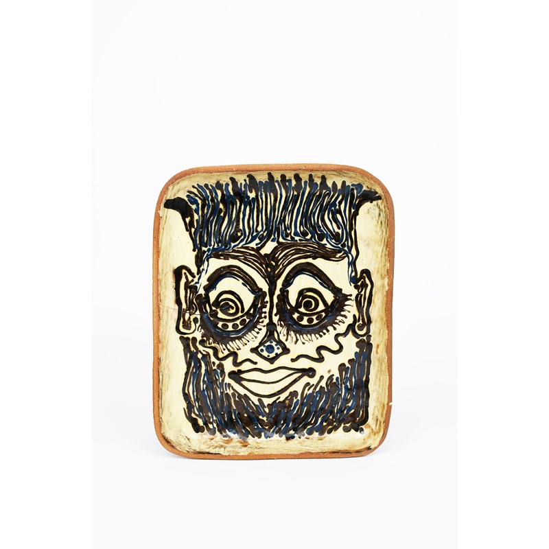 an early Bryanston School slip decorated dish, decorated with a bearded figure, in brown and blue slip on a cream ground,