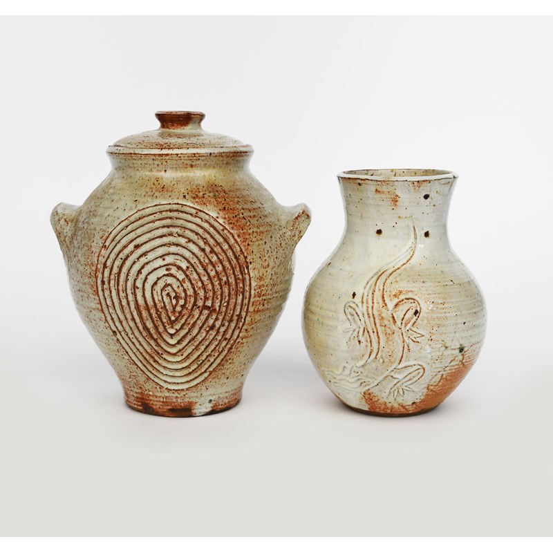 an early stoneware jar and cover, twin-lug handles, incised with circular maze design, covered in a speckled tin-glaze, a vase similar decorated in low relief with a lizard, a footed bowl with incised inscription, a covered tureen, a large bowl and a mug,