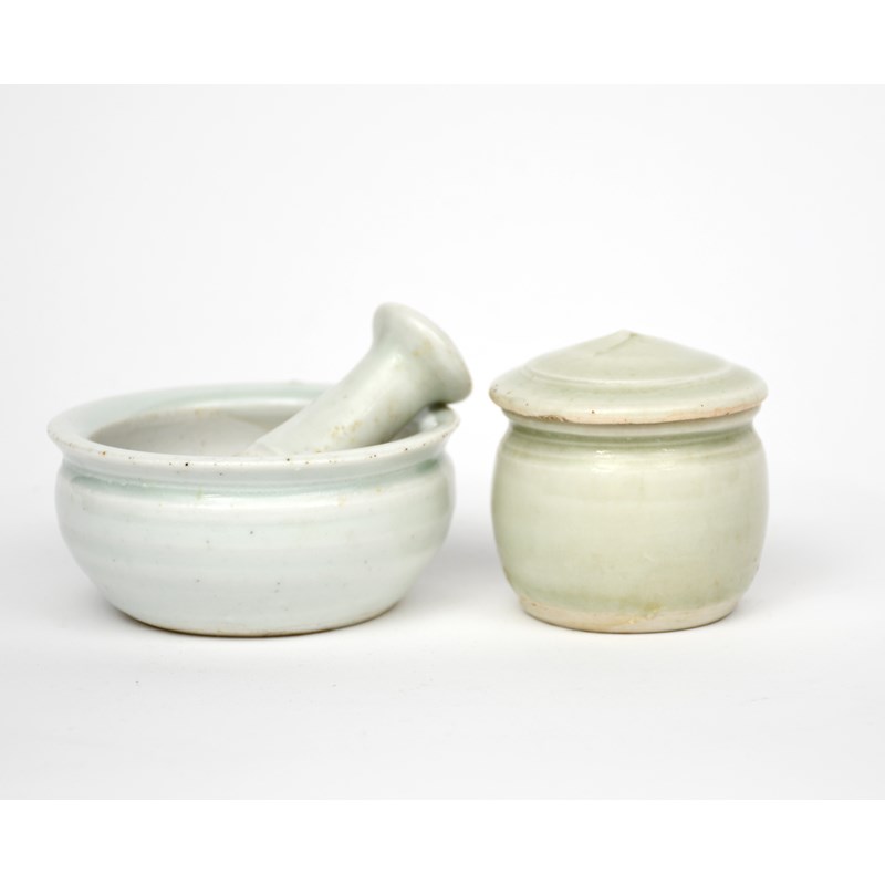 a small porcelain box and cover, covered in a oak ash glaze, and a porcelain pestle and mortar,
