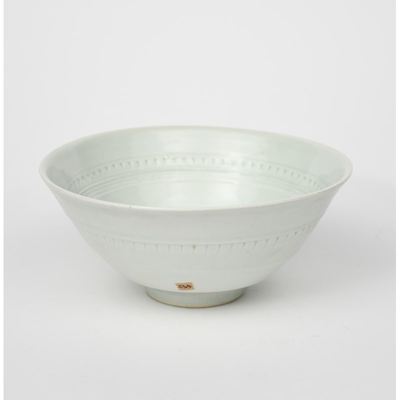a large porcelain bowl with chattering band, covered in a pale oak ash glaze,