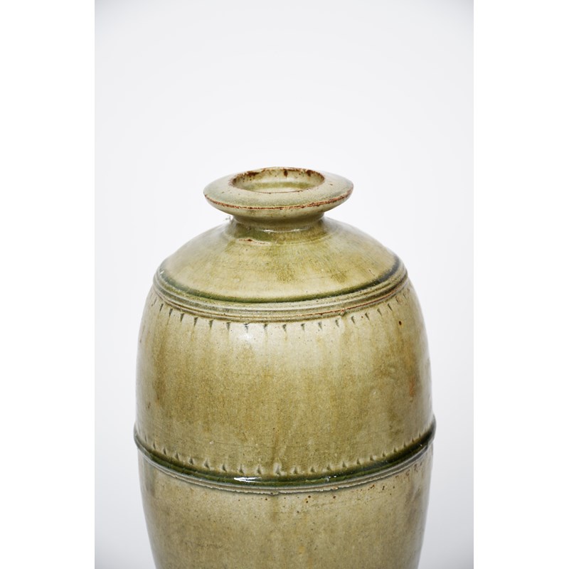 a stoneware bottle, with chatter and raised bands, covered to the foot with an ash glaze