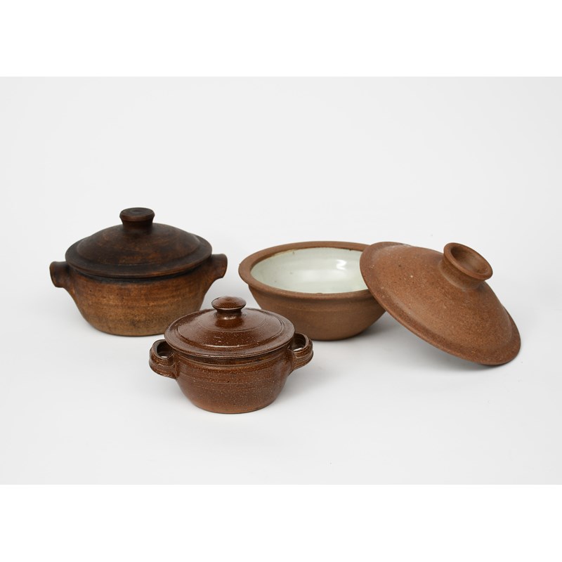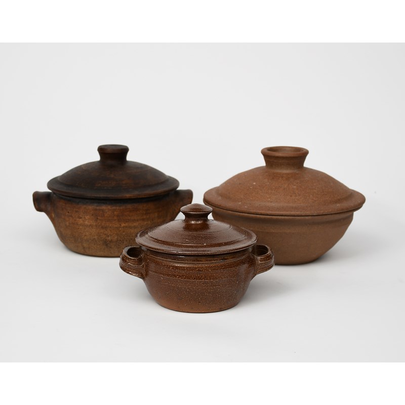 an early salt-glaze stoneware casserole and cover, twin-handled form, the interior glazed ash, and two other casserole dishes and covers