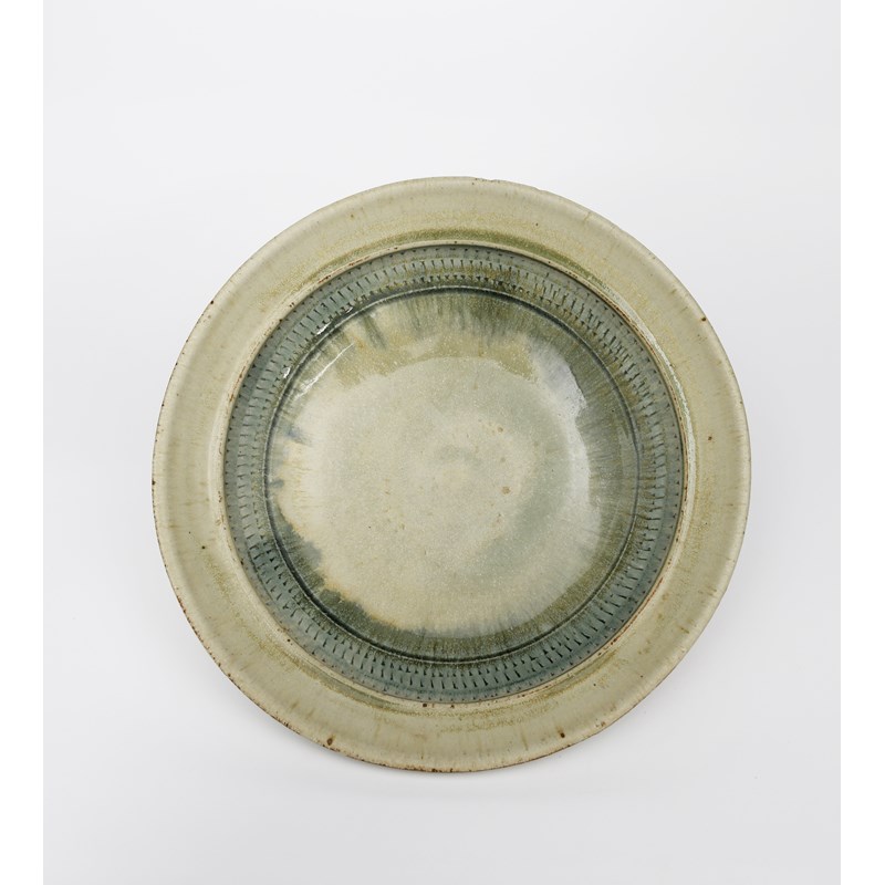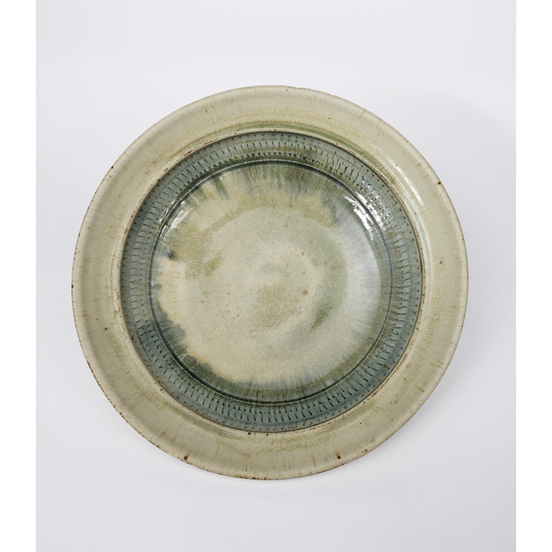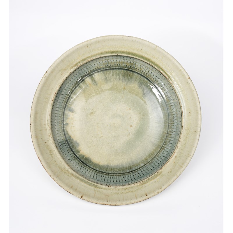 a large stoneware fruit dish with chatter bands, the ash glaze with blue,