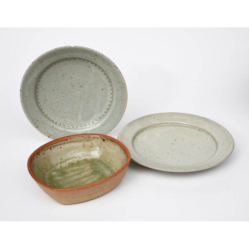 two graduated stoneware plates with chatter band, with white slip and a stoneware oblong dish