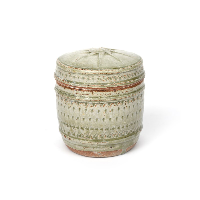 an early stoneware caddy and cover, with chatter bands, covered to the foot with an ash glaze,