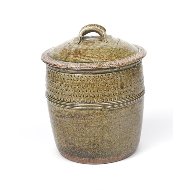 a large salt-glaze stoneware storage jar and cover with broad chatter band, covered to the foot with ash glaze,
