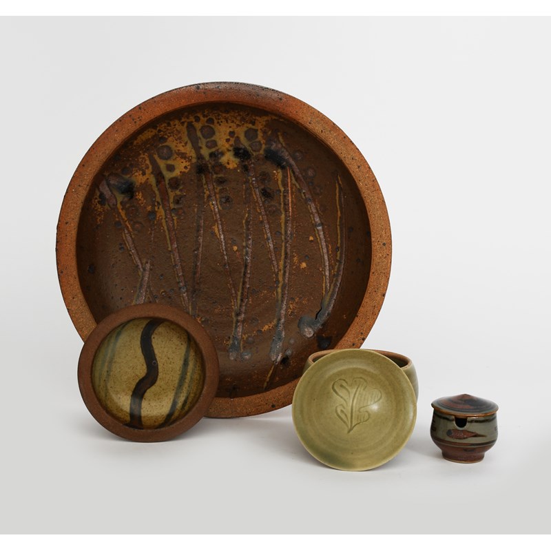 a stoneware plate, decorated with a zigzag motif in rust and brown, a small Leach Pottery 'Willow' pattern stoneware dish, a Leach Pottery pot and cover, the cover incised with a stylised oak leaf under a celadon glaze and a small pot and cover probably Crowan Pottery