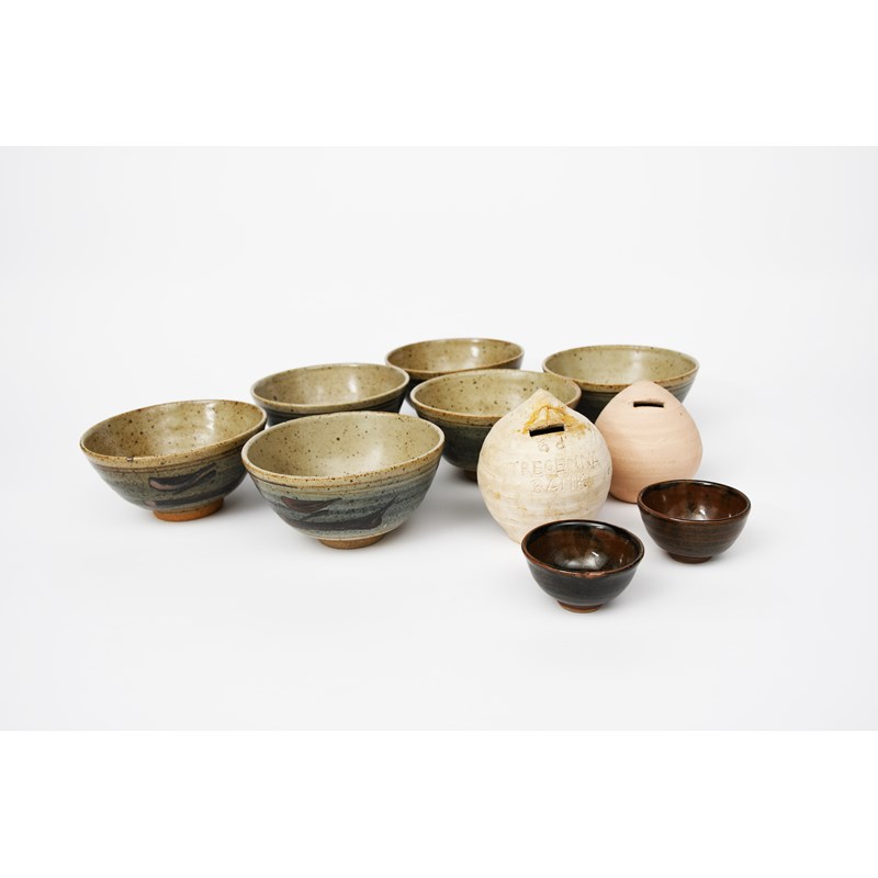 a set of six stoneware bowls, each glazed ash, with brushed tenmoku design over translucent cobalt band, two miniature bowls glazed tenmoku and two unglazed piggy-bands, one titled Tregenna Bank,