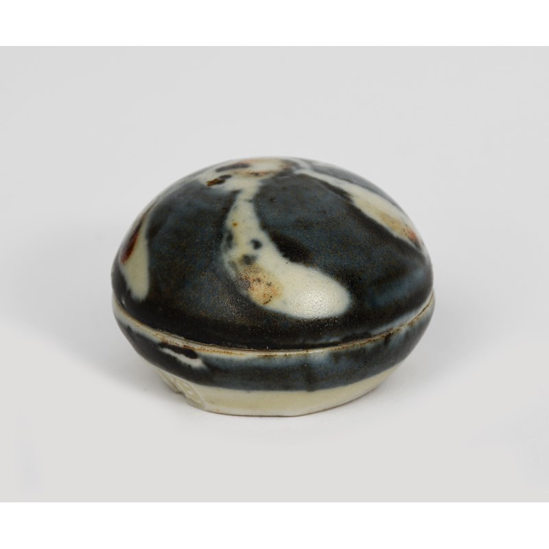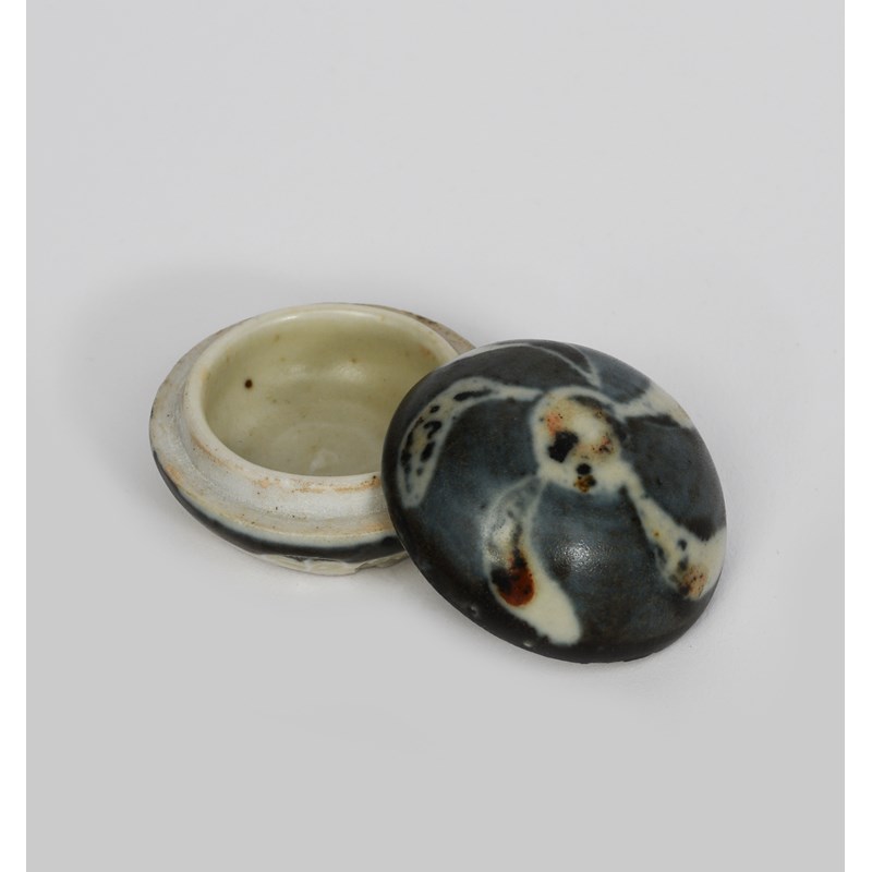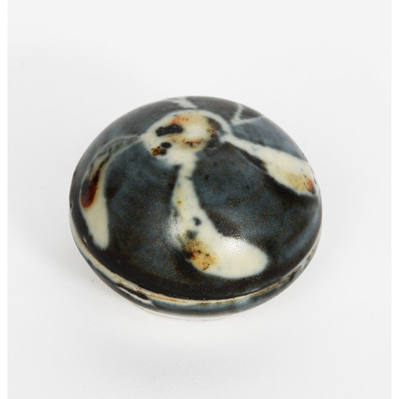 A Leach Pottery porcelain miniature box and cover, circular form, painted with a radiating floral motif, in blue,