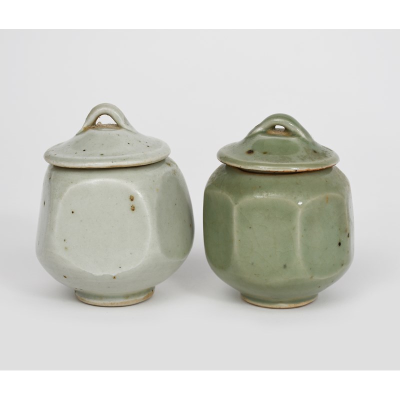 a Leach Pottery porcelain jar and cover, cut sided form, covered in a celadon glaze, and another similar