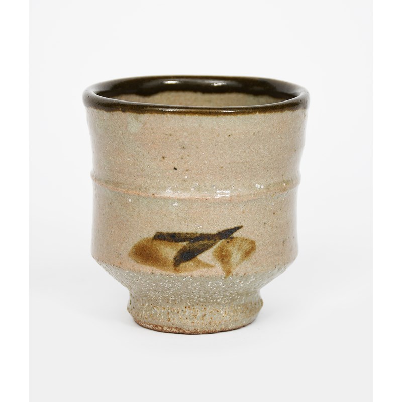 a stoneware unomi, footed cylindrical form, simple brushed design and rim band on an ash glaze