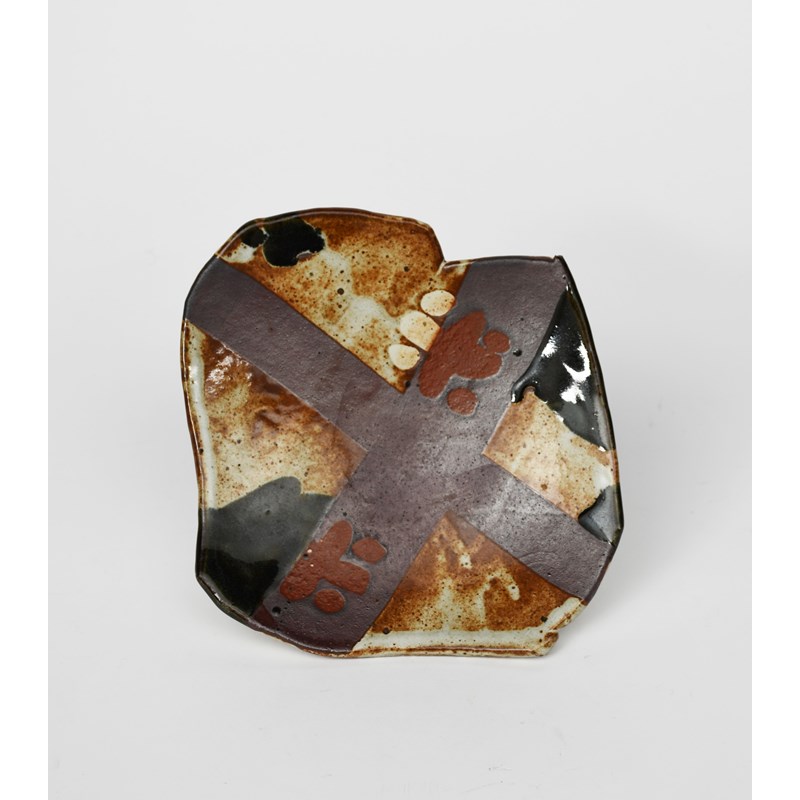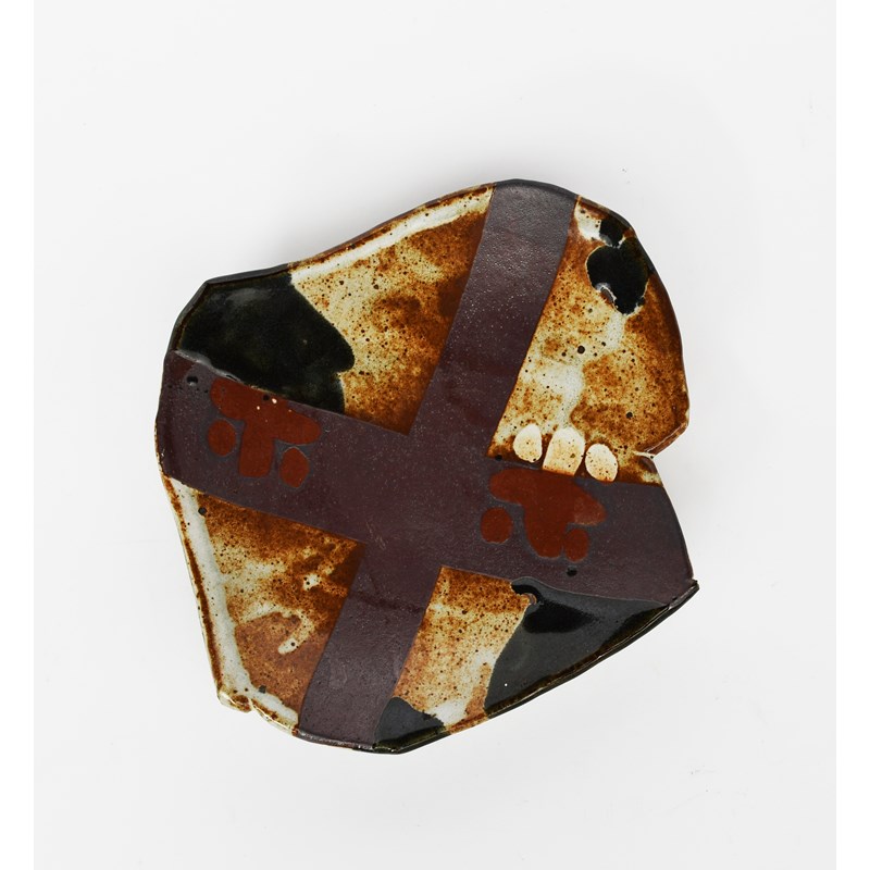 a stoneware footed dish, glazed with large cross motif, in shades of dark chestnut, red and white