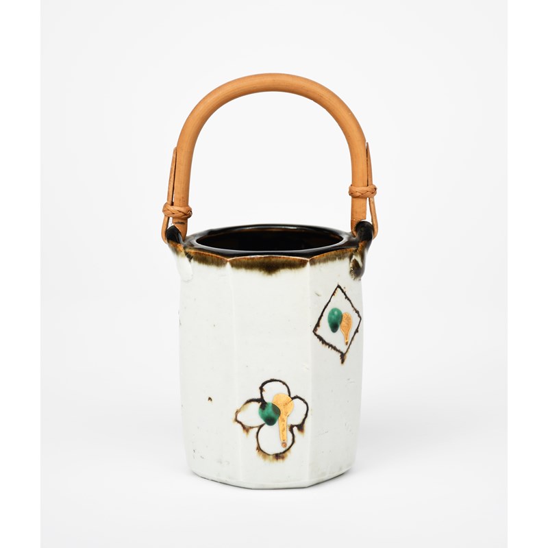 a stoneware pot with cane handle, octagonal cylinder form, painted with simple geometric motif in tenmoku and green, highlighted in gilt on a silver-grey ground,
