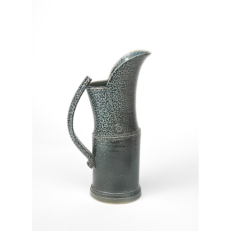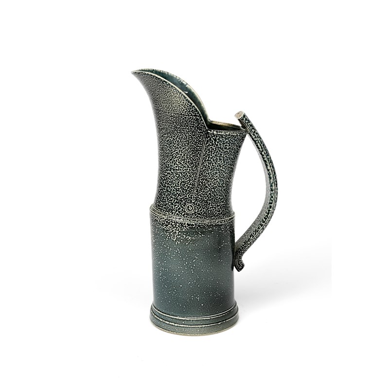 a tall salt-glaze stoneware jug, with applied strap handle, covered in a blue salt-glaze,