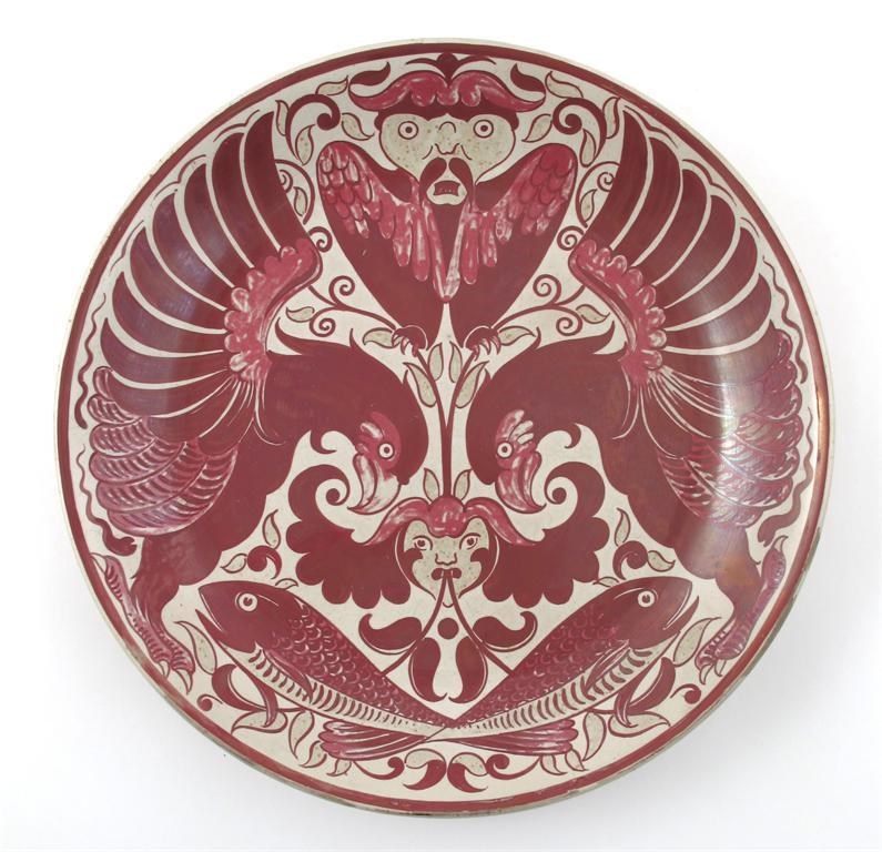 A William De Morgan pottery charger painted by Halsey Ricardo, in ruby with a mysterious winged portrait, flanked by hawks, above a mask and leaping fish, painted HR monogram, glaze loss to rim 37cm. diam.