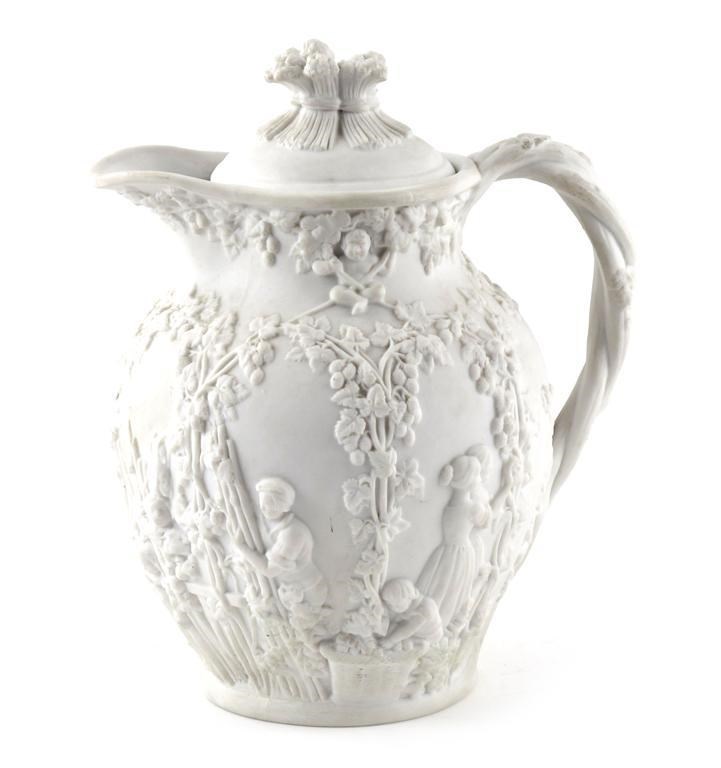 A Summerley Art Manufacturing Hop Gathering parian beer jug and cover designed by H J Townsend, cast in low relief with figures harvesting and sacking hops impressed mark and regd diamond, repaired damages 24cm. high
