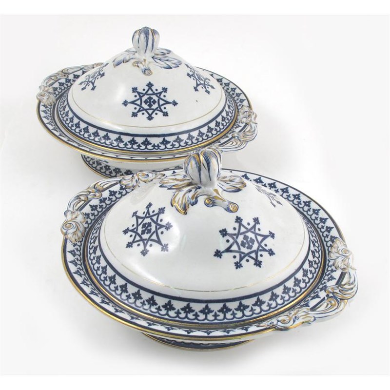 A Pair of Minton tureen and covers designed by A W N Pugin, printed with a blue foliate repeat border, highlighted in gilt, with bud finial impressed and printed marks, Lawleys retail mark 29cm. wide