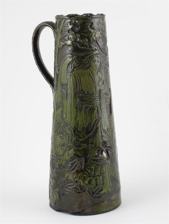 A tall Farnham Pottery jug tapering form incised with a Pre-raphaelite maiden, glazed green and brown monograms to base, glaze chips 33.5cm. high